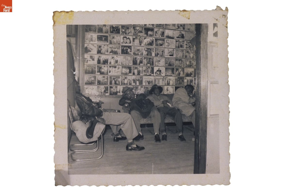 Fox Brothers Clothier in Chicago outfitted many Black American entertainers. Shop owner Harold Fox (1910-1996) had previously worked as an itinerant musician. He used his connections to attract a high-profile clientele, which included artists such as Cab Calloway, Louis Armstrong, and Bill "Bojangles" Robison. This photograph shows The Orioles, a pioneering Rhythm and Blues vocal group, at his shop.