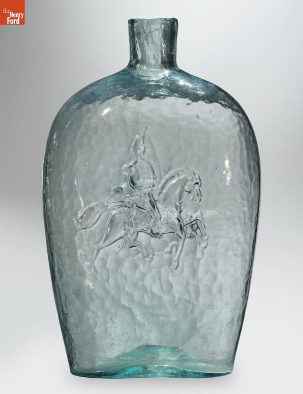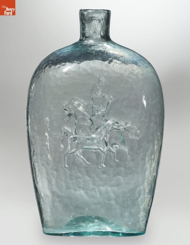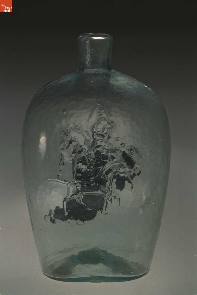 Glass factories in America began producing inexpensive, mold-formed flasks in the early 1800s. These figured flasks often were decorated with symbols of national pride or political or cultural affiliation. This late-century flask with its image of a hunting dog on the reverse may have appealed to hunters and sportsmen.