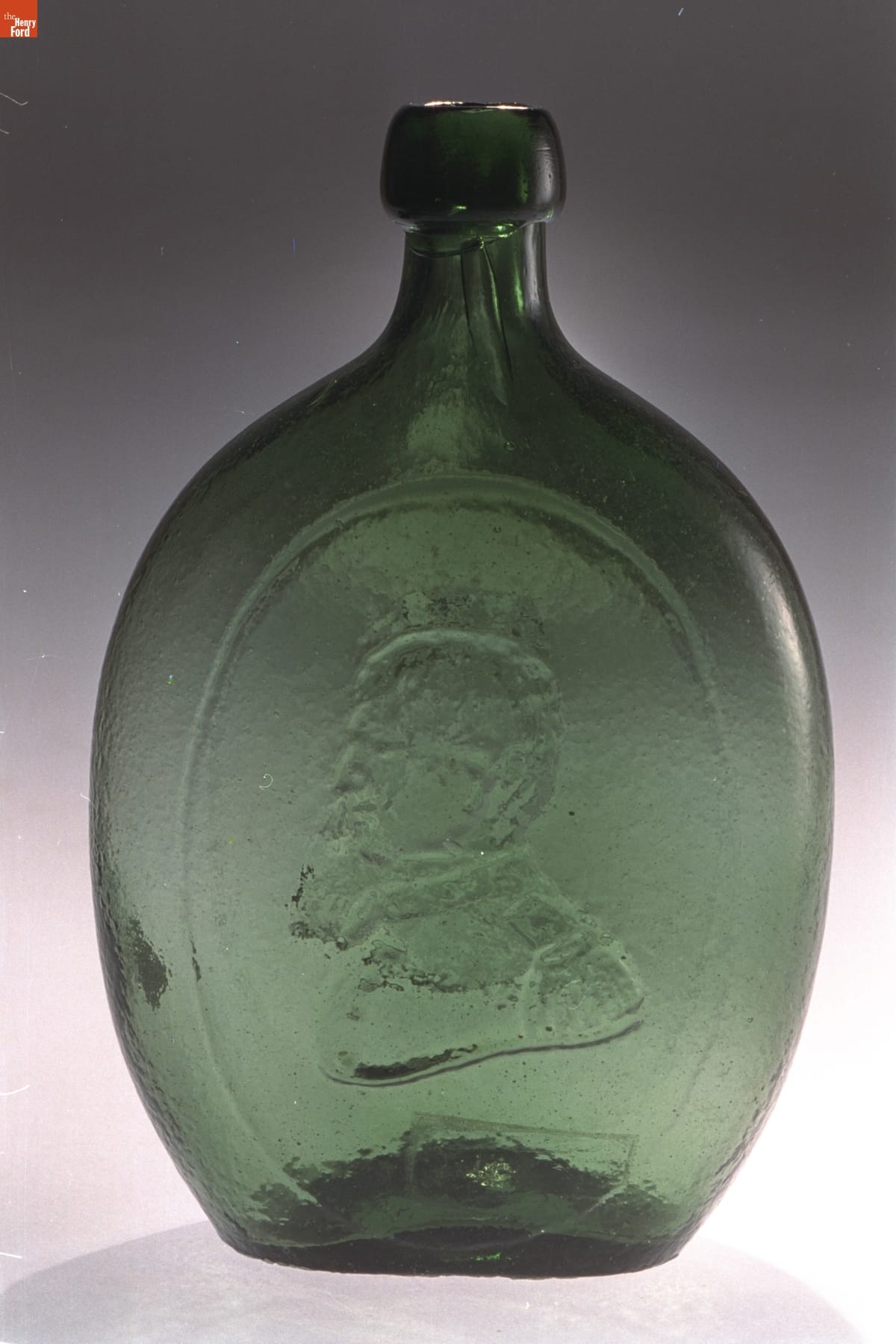 Whether depicted as commander-in-chief, the first president of the United States, or a symbol of the republic, George Washington is a common likeness on early American flasks. Washington appears on 72 recorded flask designs--more than any other person. This example depicts Washington as a classical statesman with major general Zachary Taylor, who became the 12th United States president in 1849.