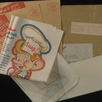 SNAP! [printed on chef's hat] KELLOGG'S / CLOTH DOLL... / "SNAP"... [printed on cloth] CORP. 1948 KELLOGG CO., BATTLE CREEK, MICH. [printed on cloth]