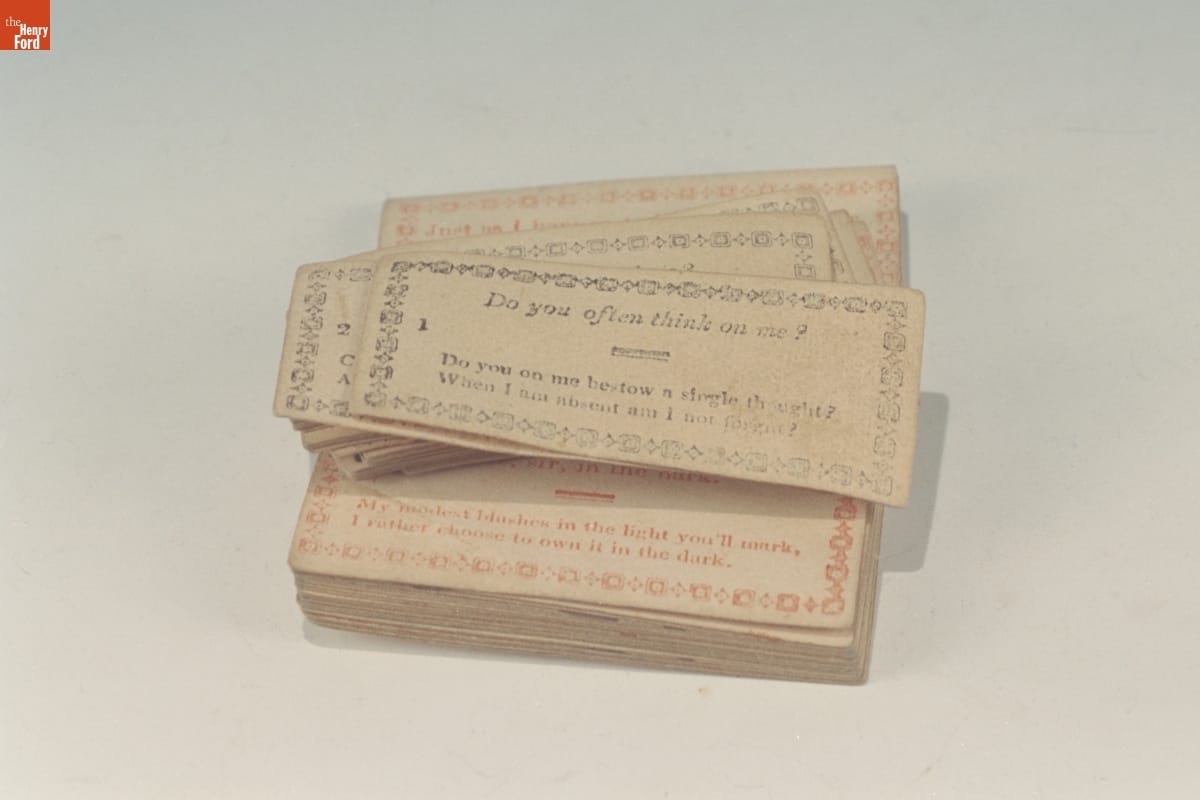 Conversation cards, usually made for adult partygoers, consist of question and answer cards. Couples choose cards at random. One reads a question card, the other an answer card. The answer, when read, could start conversations or produce laughter at the nonsensical response. This set was made in the mid-1800s by an unknown printer.
