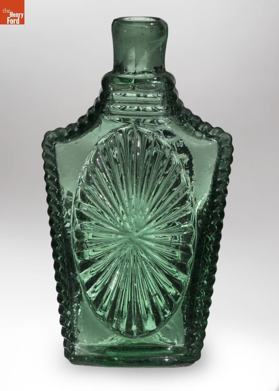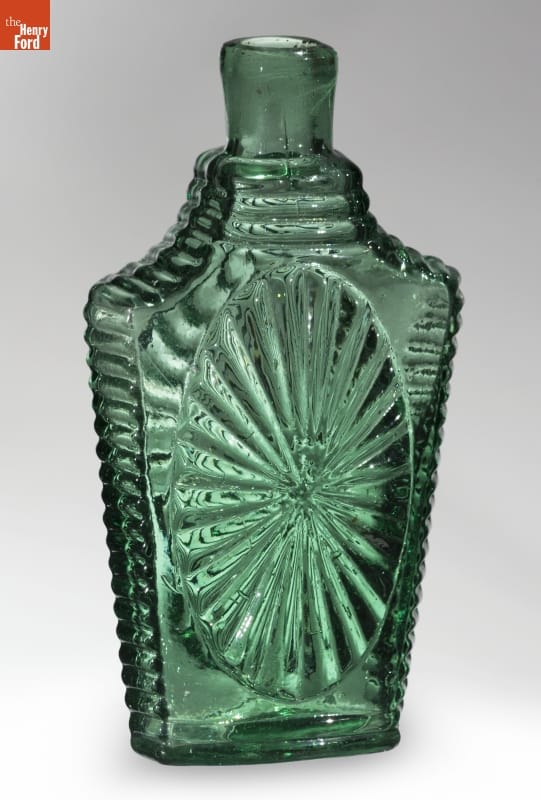 Glass factories in America began producing inexpensive, mold-formed flasks in the early 1800s. These figured flasks, often embellished with symbols of national pride or political or cultural affiliation, appealed to America's common man. Purely decorative flasks, however, were another option. These flasks -- like this sunburst-pattern one -- held alcohol just as well as those with images of great men or patriotic emblems.
