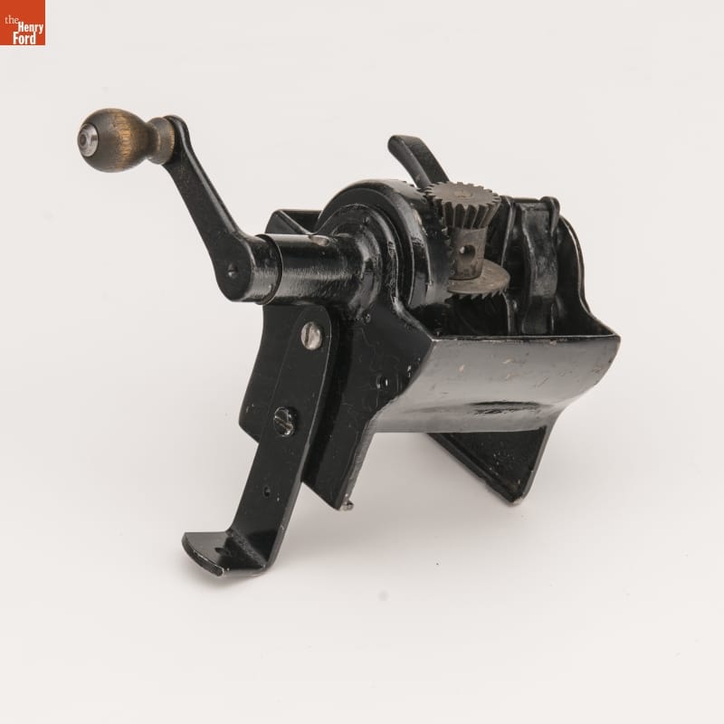 The Planetary Pencil Pointer, patented in 1896, provided an alternative to the small manual sharpeners that required users to turn the pencil against a fixed blade. By turning the crank, two milling disks rotate on their axes as they spin around the stationary pencil--like planets revolving around the sun--creating a usable point.