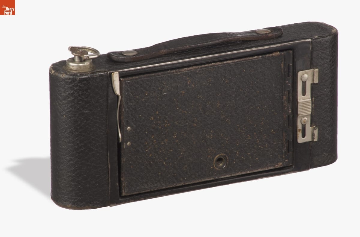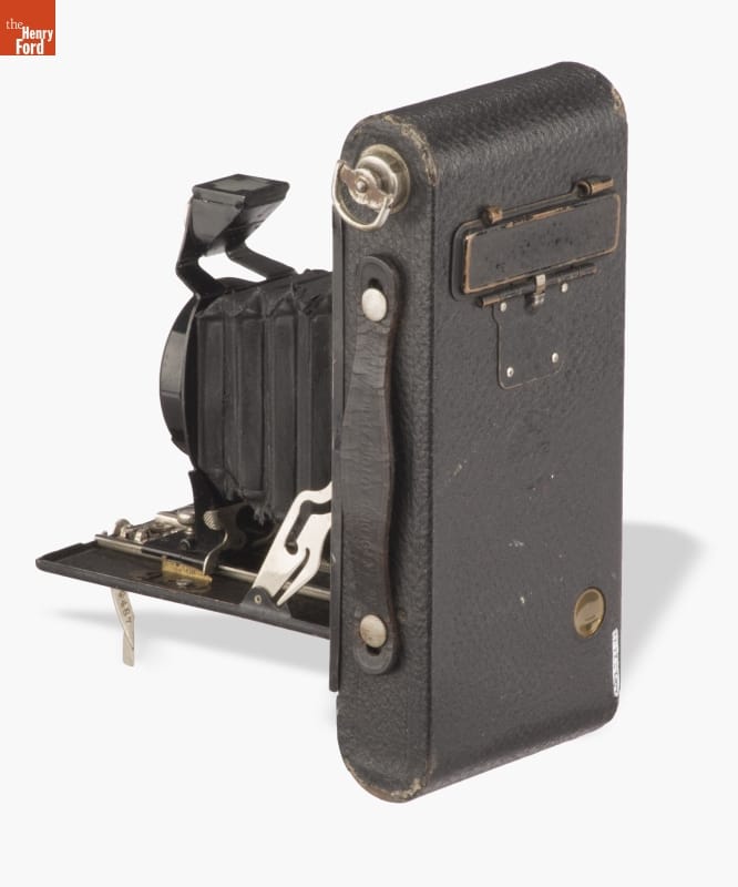 Folding cameras were designed to be portable and rugged. The lens sits at the end of a collapsible bellows system, often adjustable to provide better focus. The camera's back typically contains 120 roll film, with multiple exposures on a roll. Popular from 1900 until the introduction of 35mm film in 1945, many amateur photographers owned cameras like this.