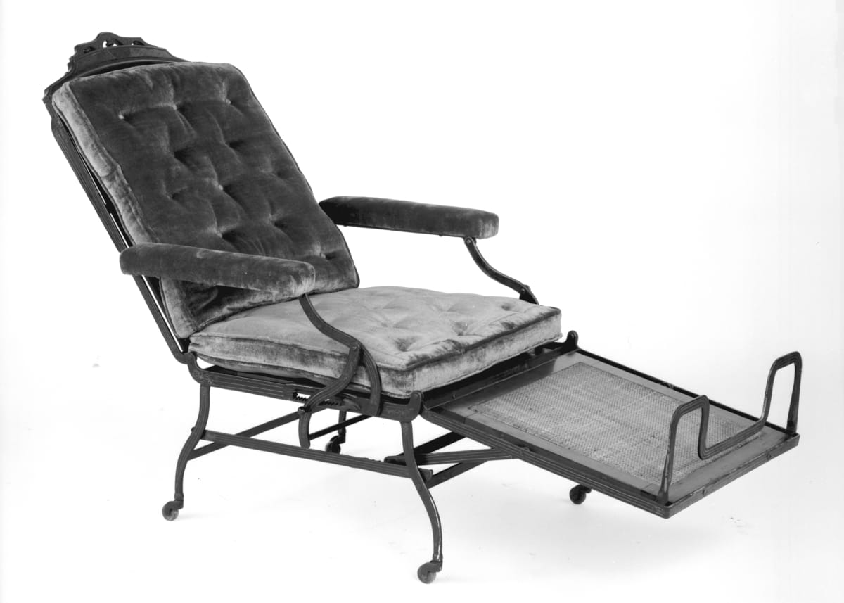 Victorian Americans enjoyed reclining in adjustable chairs like this one, popular during the late 19th century. These innovative mass-produced chairs featured functionality over style. This type of furniture appealed most to a growing middle class and would have served as a novelty piece in a parlor or sitting room.