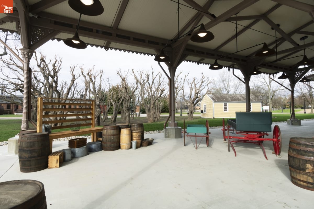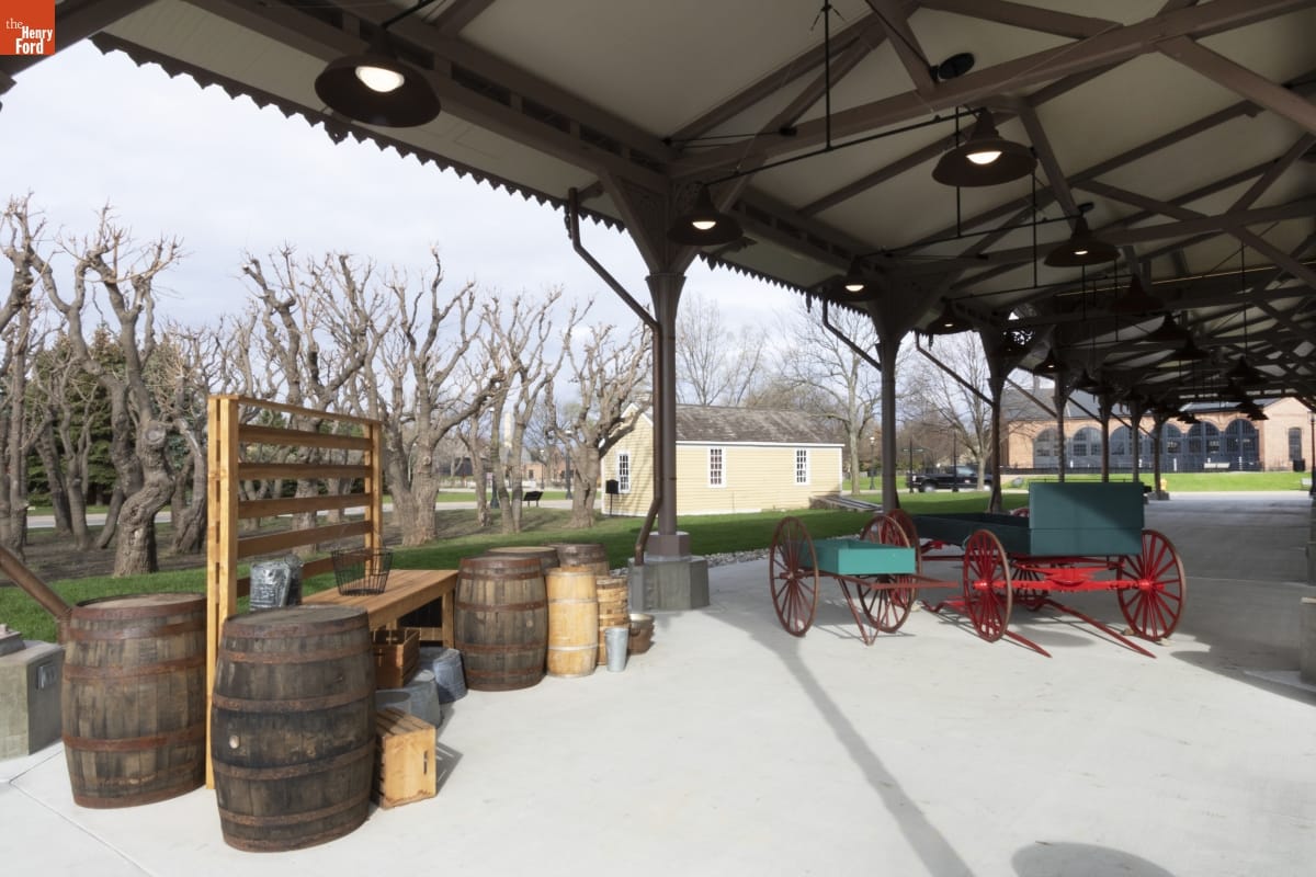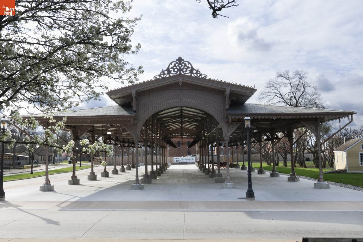 The Detroit Central Market's vegetable shed sheltered vendors and customers from 1861 to 1894. The structure was then removed to Belle Isle and was slated for demolition in 2003 when The Henry Ford acquired it. The reconstructed building--which opened in Greenfield Village in 2022--includes several original cast-iron columns and ornamental woodwork, siding, and other details that convey the Swiss-Chalet aesthetic of the original design.