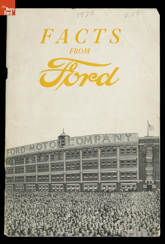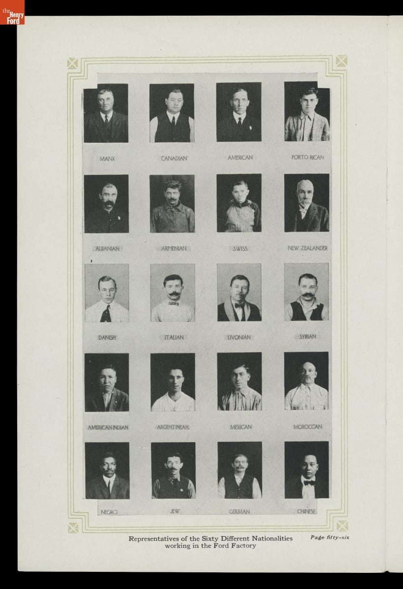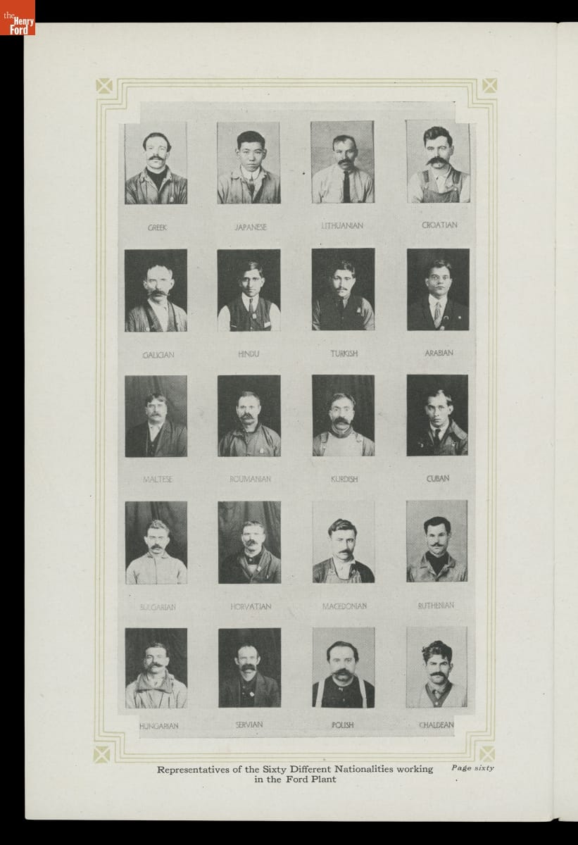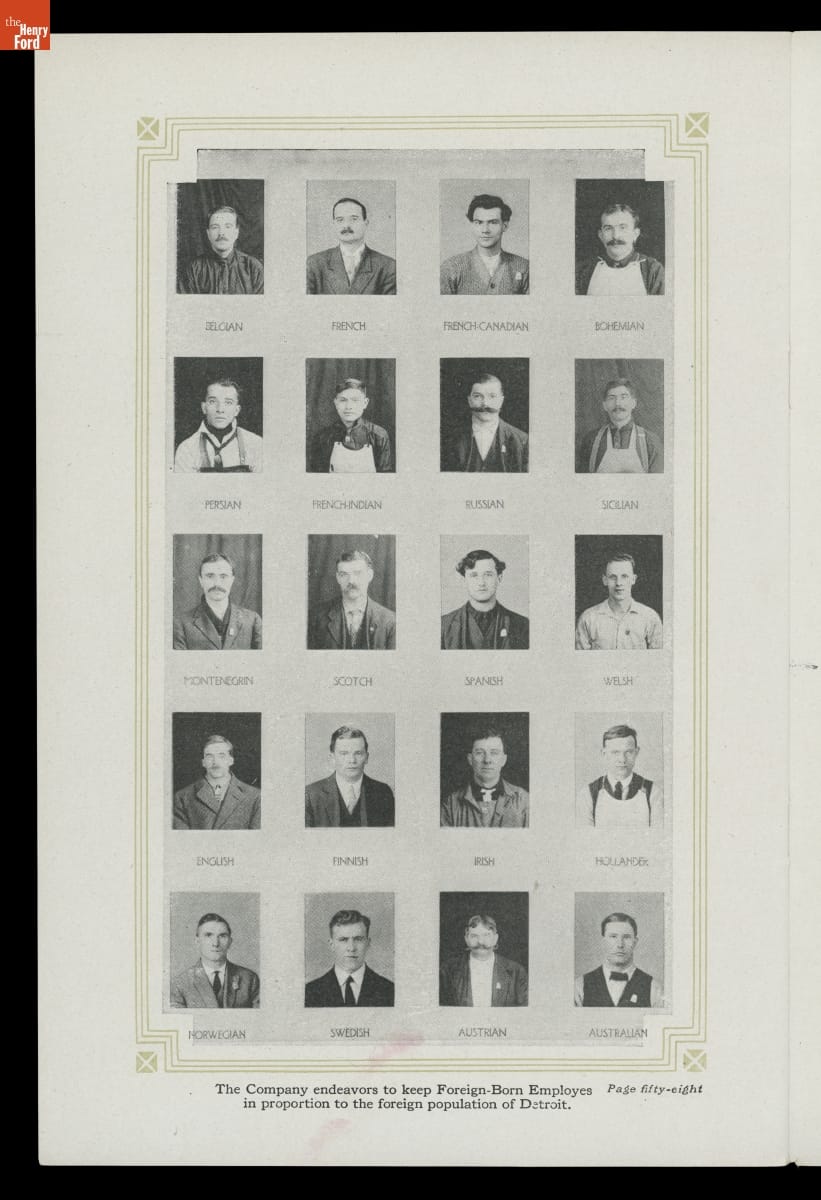 Facts from Ford, published by Ford Motor Company's Sociological Department, kept Ford employees informed about their place of employment. This 1920 issue highlighted the ethnic diversity found at the Highland Park plant and included photographs of 60 workers, all with different nationalities. Ford tried to keep the number of foreign-born employees proportional to Detroit's foreign population.