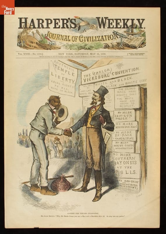 African Americans, able to move more freely after the Civil War, searched for new opportunities. White landowners sought to control this movement of labor that disrupted the plantation economy. In 1879, white leaders gathered in Vicksburg, Mississippi, to discuss ways to improve the situation. This Harper's Weekly illustration lampooned the convention as a spider trap to blacks who succumbed to empty pledges of white landowners.