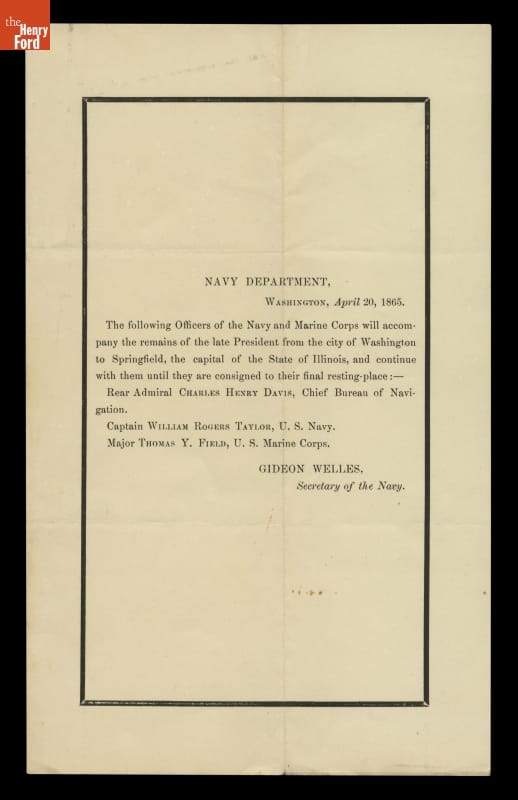 Order from U.S. Navy Secretary Gideon Welles Naming Officers to Accompany President Lincoln's Funeral Train, April 20, 1865