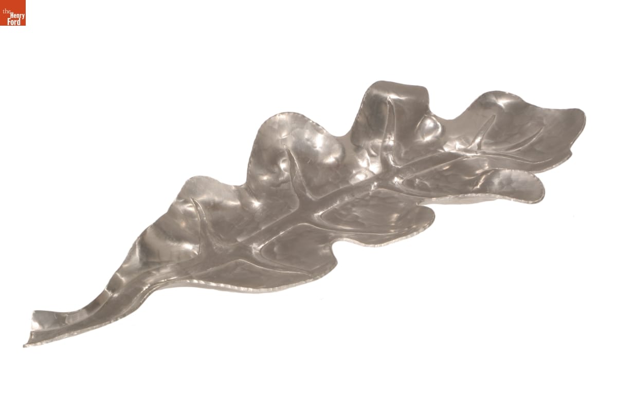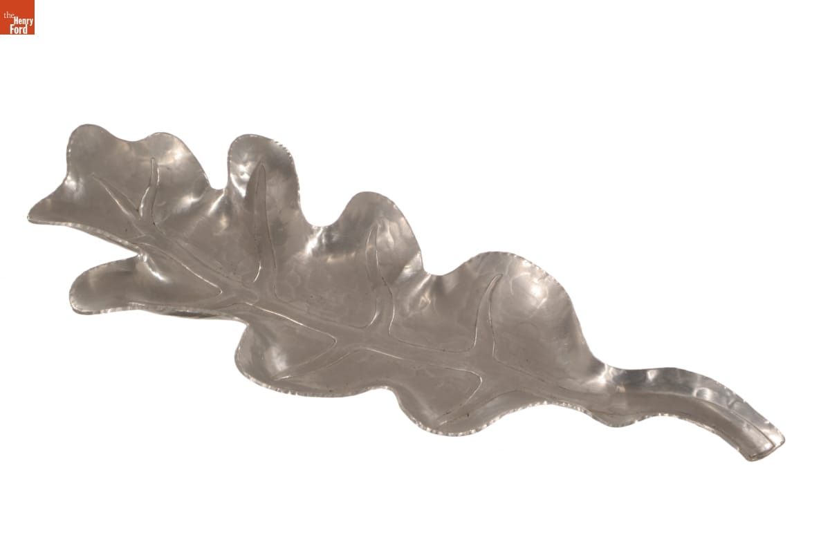 In 1940, industrial designers Russel and Mary Wright developed a housewares merchandising program called "American-Way," which sought to bring craft and industry together. Craftsmen, artists, designers, and manufacturers -- such as Everlast Metal Products Corporation who specialized in aluminum giftware -- contributed designs and products to the project. Mary Wright collaborated with Everlast to create the "Fallen Leaves" design seen in this piece, made for American-Way.