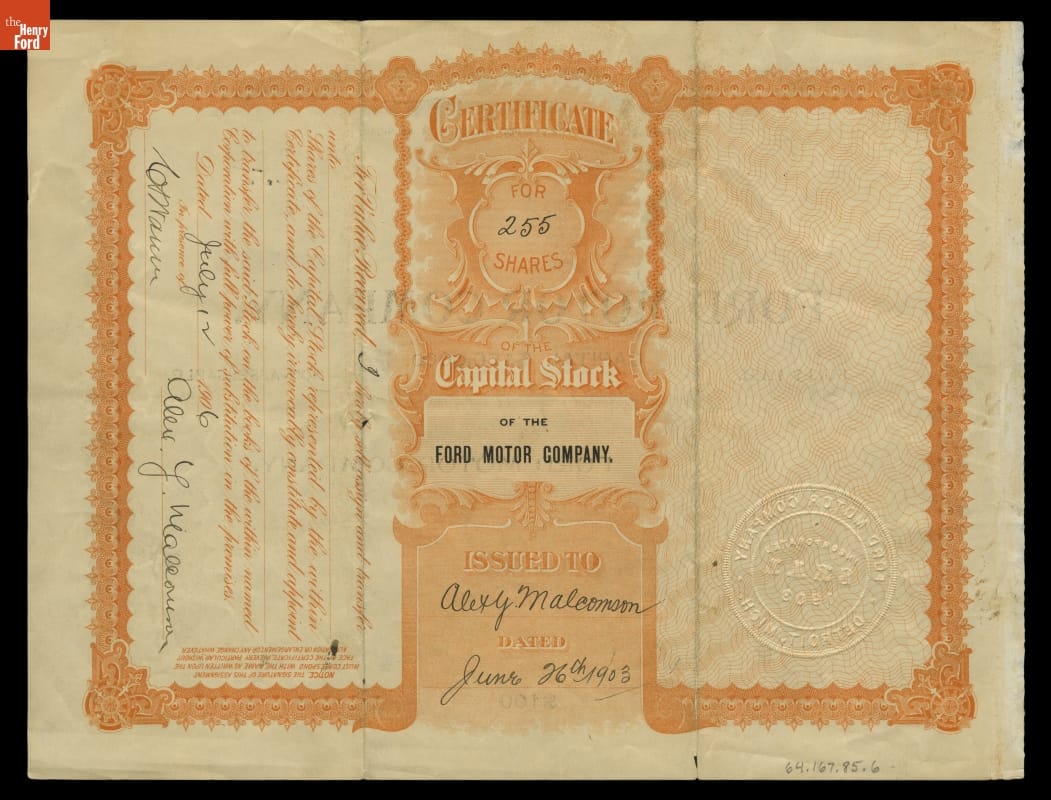 This is one of the first shares of Ford stock. It was issued to Alexander Malcomson, a wealthy Detroit coal merchant. He took a liking to young Henry and agreed to back his third attempt at starting a company despite the fact that Ford had failed twice before. Malcomson was instrumental in finding wealthy backers for the new company.