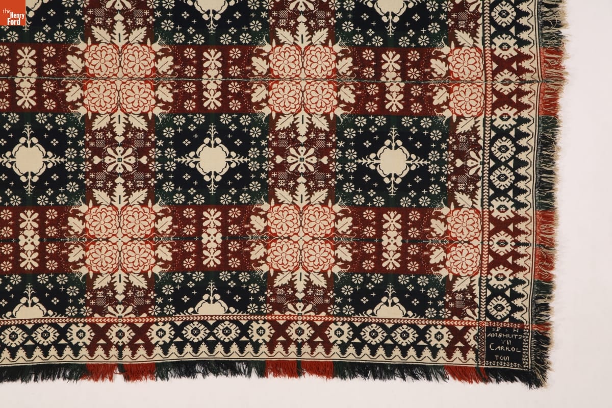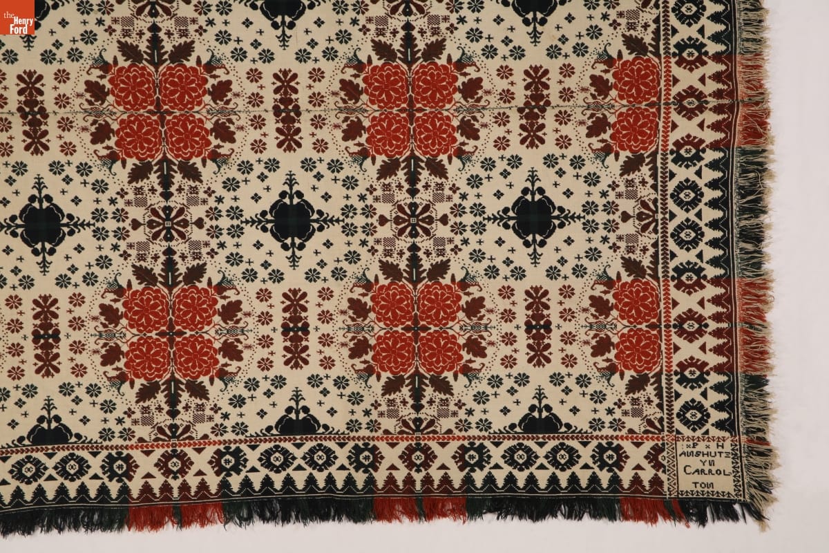 A coverlet is a decorative bedcovering--usually made of cotton and wool--woven on a loom. Philip Anshutz, an immigrant from Germany, wove this coverlet in Carrollton, Ohio, in the 1840s. Many coverlet weavers were immigrants, often bringing weaving techniques and designs with them from their native lands.