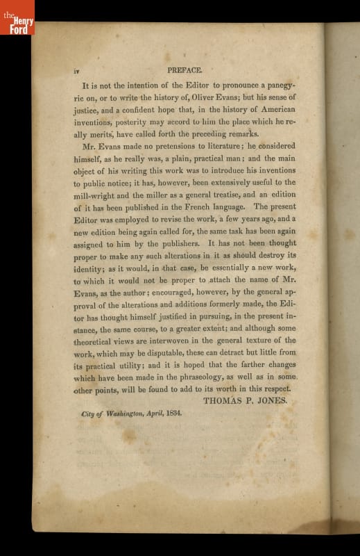 On spine: MILL-WRIGHT'S / GUIDE On title page: THE / YOUNG MILL-WRIGHT / AND / MILLER'S GUIDE; / ILLUSTRATED BY / TWENTY-EIGHT DESCRIPTIVE PLATES. / BY OLIVER EVANS, / THE NINTH EDITION, / WITH ADDITIONS AND CORRECTIONS, / BY / THOMAS E. JONES, / ...