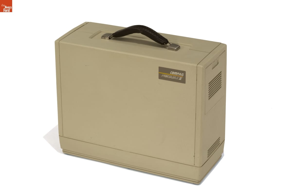 This Compaq Portable II computer is a "luggable" system, complete with a sturdy carrying handle. It is one of the first IBM-compatible portable computers, and improves upon earlier Compaq models by adding two internal floppy disk drives. Weighing 26 pounds and with a price close to $5000, the concept of mobile, affordable computing was quite different than it is today.