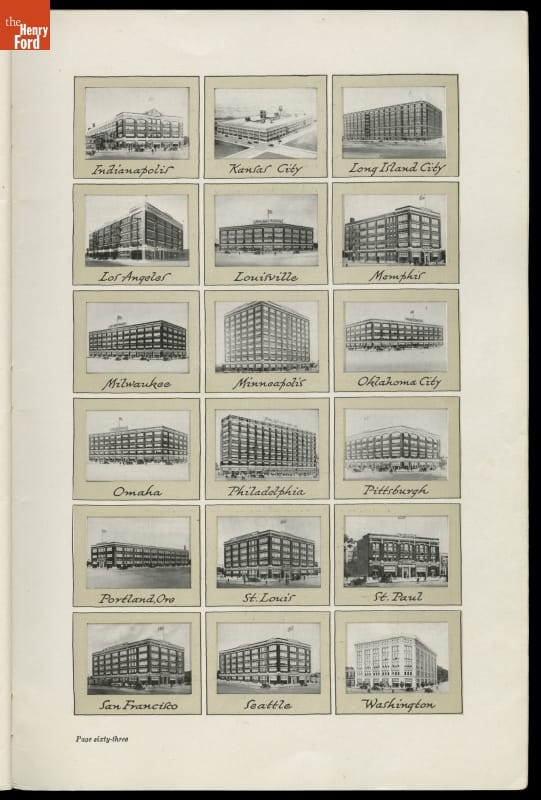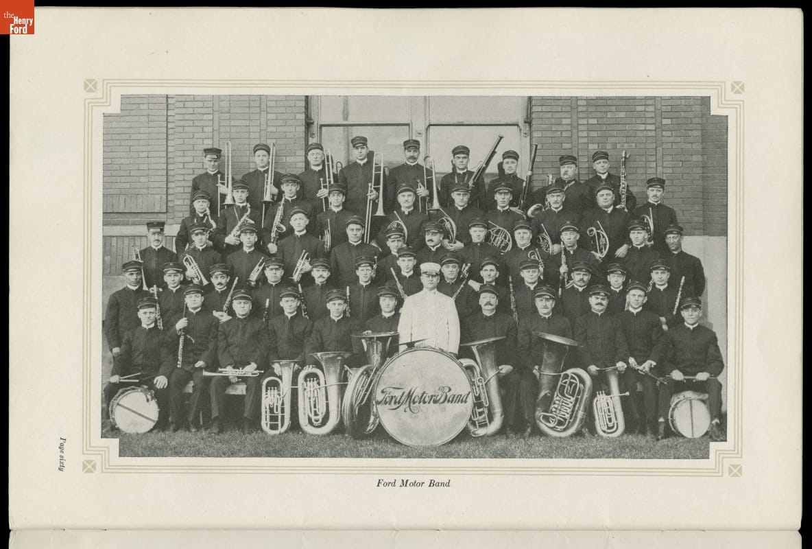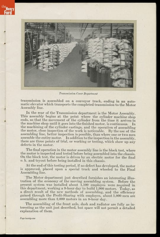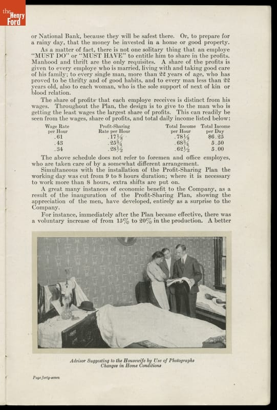 This pamphlet covers topics about Ford Motor Company and highlights the Ford Sociological Department. The department was created to ensure that employees, many of whom were non-English-speaking immigrants, did not squander their $5 per day wages. Investigators monitored the personal and work lives of employees. In addition, the department provided hygiene instruction, financial and legal advice, and an English-language school.
