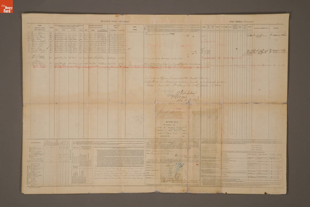 Many African Americans proudly joined the Union Army during the Civil War. Though at first turned away, after May 1863 the U. S. War Department began to actively recruit African-American troops. By war's end over 180,000 men in 175 regiments had joined the United States Colored Troops. This muster roll reveals the names of men serving in Company E, 46th Regiment in 1865.