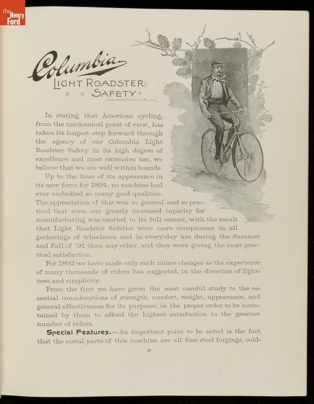 The Pope Manufacturing Company produced this catalog to sell Columbia bicycles in 1892. Buyers could choose between a number of "safety" and high-wheel cycles after paging through the catalog. The company also provided descriptions of bicycle accessories available. And if you were unsure about this new mode of transportation, check out page 38 on why you should ride a bicycle.
