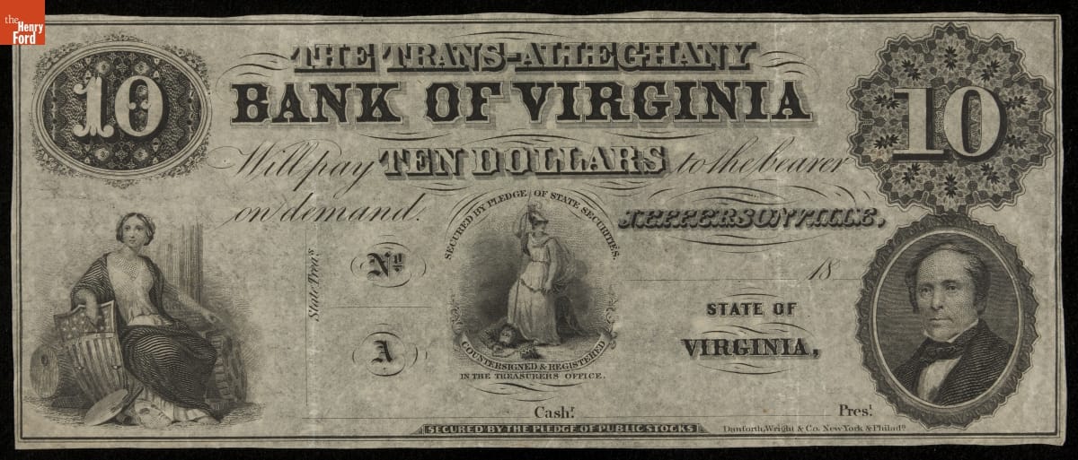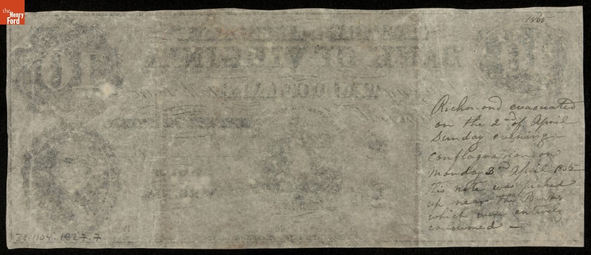 Recto, in part: 10 / THE TRANS-ALLEGHANY / BANK OF VIRGINIA / WILL PAY TEN DOLLARS / TO THE BEARER / ON DEMAND / JEFFERSONVILLE, / STATE OF VIRGINIA / DANFORTH, WRIGHT, & CO. NEW YORK & PHILAD Handwritten verso: 1865 / Richmond evacuated / on the 2nd of April / Sunday evening / conflagmation on / Monday 3rd April 1865 / This note was picked / up near the banks / which were entirely consumed