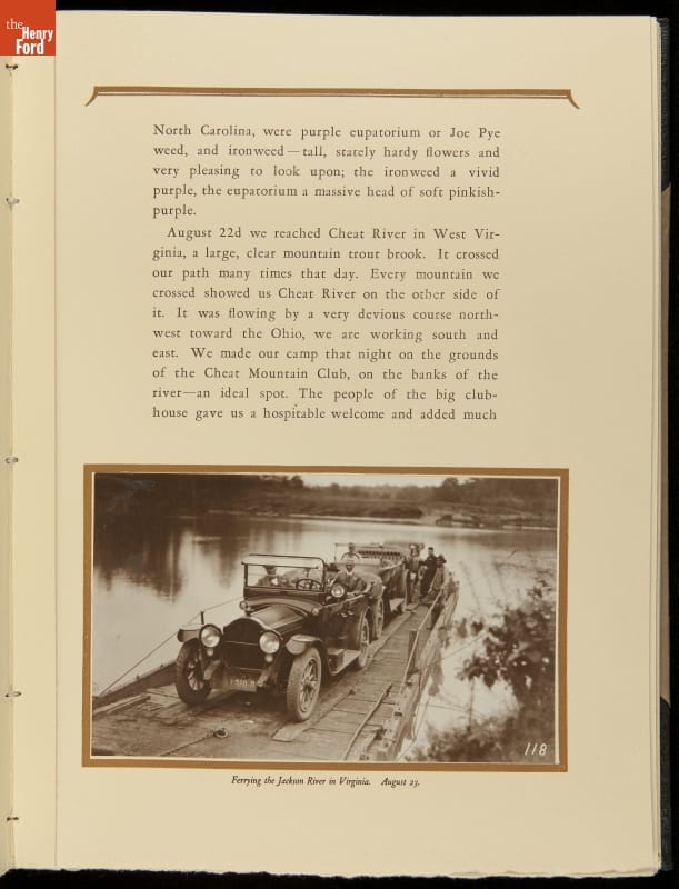 John Burroughs chronicled the Vagabonds' 1918 camping trip through the central Appalachians. The self-named Vagabonds -- Henry Ford, Thomas Edison, Harvey Firestone, and Burroughs -- began taking excursions in 1916 to relax and enjoy each other's company. They were joined by a fifth, Edward Hurley, on this adventure. Firestone later privately published Burroughs's "mock-up" under this title, Our Vacation Days of 1918.