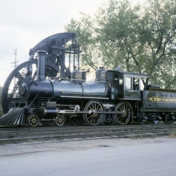 This 4-4-0 American-type locomotive pulled passenger trains on the Detroit & Lima Northern Railway, a predecessor of the Detroit, Toledo & Ironton Railroad. The 4-4-0, with four leading wheels, four driving wheels, and no trailing wheels, was a popular design on 19th-century U.S. railroads. Its small size and light weight were well suited to rough track.
