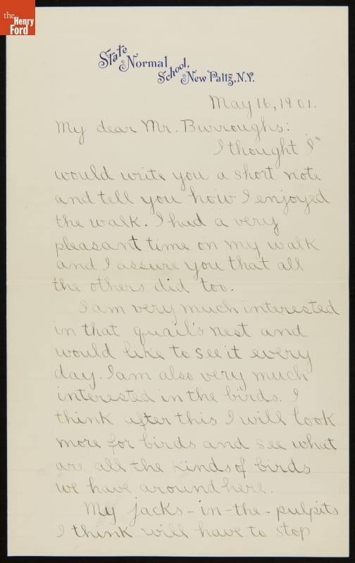 In May 1901, John Burroughs traveled to the State Normal School in New Paltz, New York, to share his love of nature with the students. On a hike he discussed the local landscape and made observations about the natural world -- the group even found a quail's nest with eggs. Students later wrote thank you notes and invited Burroughs back for a future visit.