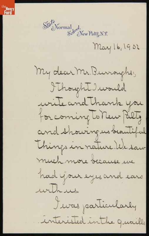 In May 1901, John Burroughs traveled to the State Normal School in New Paltz, New York, to share his love of nature with the students. On a hike he discussed the local landscape and made observations about the natural world -- the group even found a quail's nest with eggs. Students later wrote thank you notes and invited Burroughs back for a future visit.