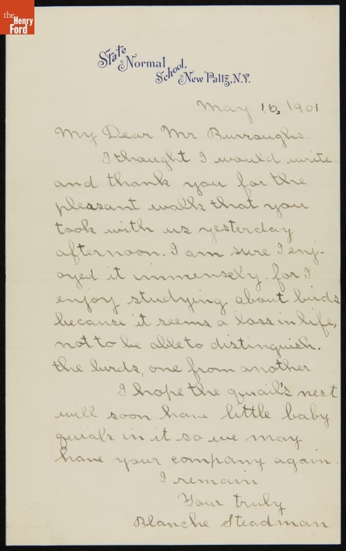 Letter to John Burroughs from Blanche Steadman, a Student Thanking Him for a Nature Walk, May 16, 1901