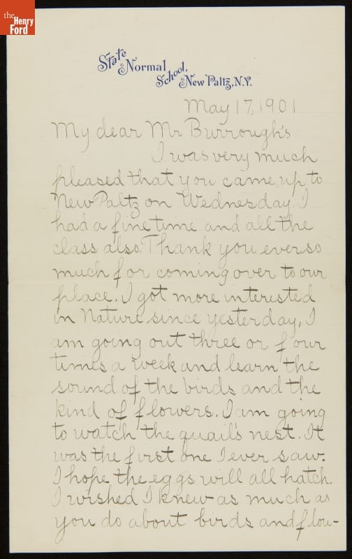 In May 1901, John Burroughs traveled to the State Normal School in New Paltz, New York, to share his love of nature with the students. On a hike he discussed the local landscape and made observations about the natural world -- the group even found a quail's nest with eggs. Students later wrote thank you notes and invited Burroughs back for a future visit.