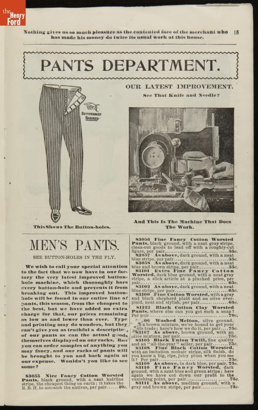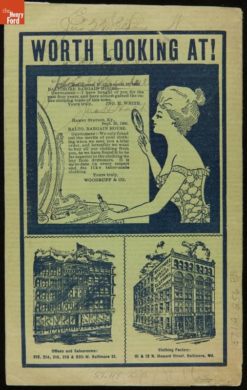 Lithuanian immigrant Jacob Epstein turned his small wholesale store, founded in 1881, into one of the biggest businesses on Baltimore's west side by the turn of the century. Baltimore Bargain House became a hub for Southern Jewish merchants and other local businessmen. Particularly unique to this catalog are the swatches of wool fabric that accompany the descriptions.
