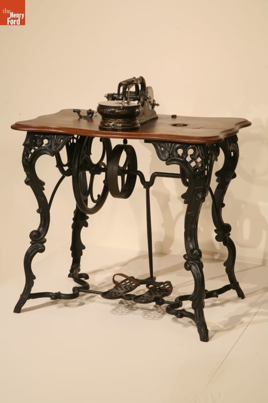 When new inventions like stoves, sewing machines and radios first came on the market, they seemed jarring and out of place next to people's furniture. Manufacturers learned that these devices would sell better if their mechanisms were hidden behind stylish cabinetry or fancy decoration. Fashionable parlor furniture inspired the ornately scrolled and pierced iron legs of this elaborately decorated sewing machine.