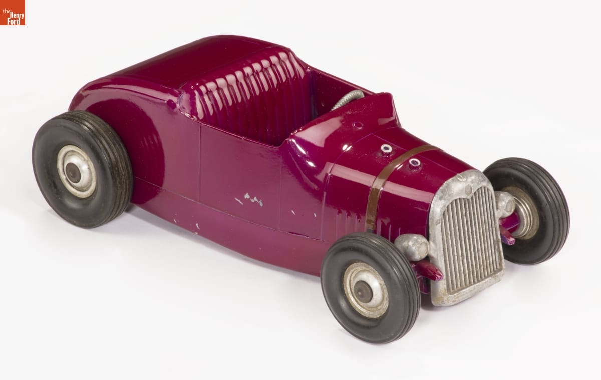 Tether cars, gas-powered model race cars, peaked in popularity in the years surrounding World War II. They were raced individually while tethered to a central pivot, or against each other on a scaled-down track. Not all tether cars were modeled after race cars. This one, from the All American Company of Los Angeles, resembles a Ford Model A "highboy" fenderless hot rod.