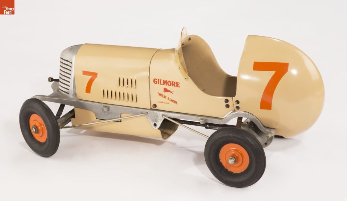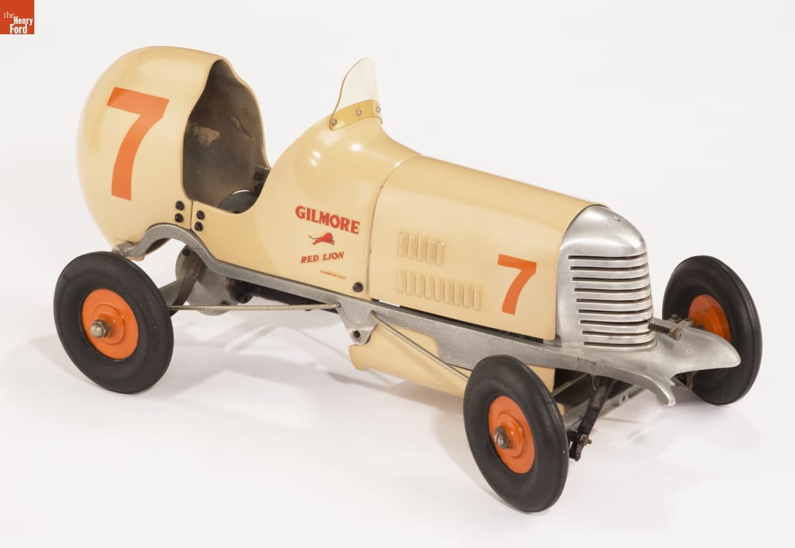Tether cars, gas-powered model race cars, were popular in the 1930s and 1940s. They were raced individually while tethered to a central pivot, or against each other on a scaled-down board track. Sponsor decals, in this case for Gilmore Gasoline with its "Red Lion" logo, added authenticity to the model racers.