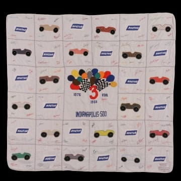 Jeanetta Holder combined her sewing talents with her love of auto racing in 1976 when she created an Indianapolis 500-themed quilt for that year's race winner, Johnny Rutherford. Holder's quilts, covered with embroidered reproductions of autographs she collected over the years, became an Indy tradition. She made this quilt for Bobby Unser in 1981 after his third and final Indy 500 victory.