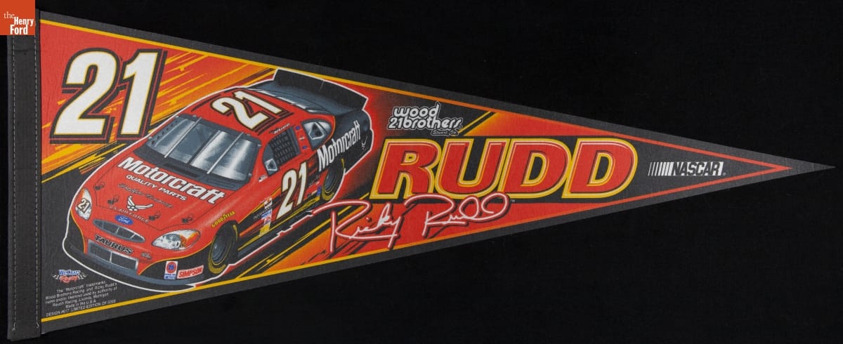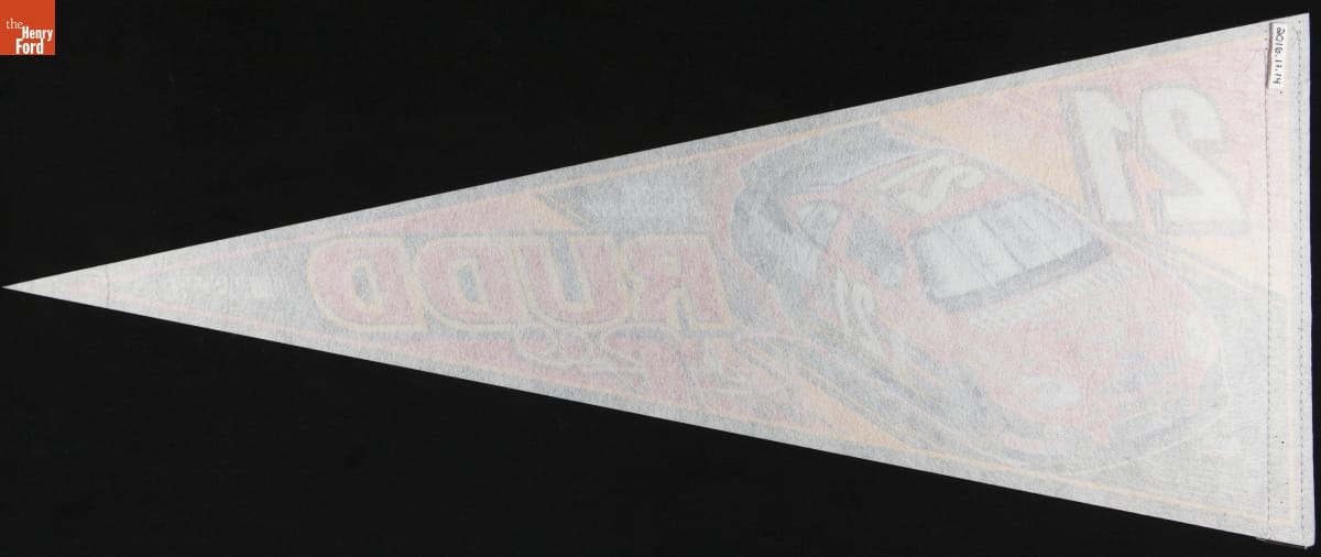 Many NASCAR fans buy souvenirs to show their support of individual drivers. Devoted followers can choose from an array of branded memorabilia--clothing, flags, decals, die cast models and other mementos. In the late 1990s and early 2000s, racing enthusiasts could purchase an inexpensive pennant like this one to wave in the stands or to decorate the walls of their homes.