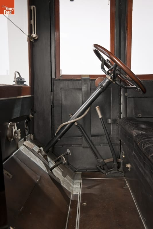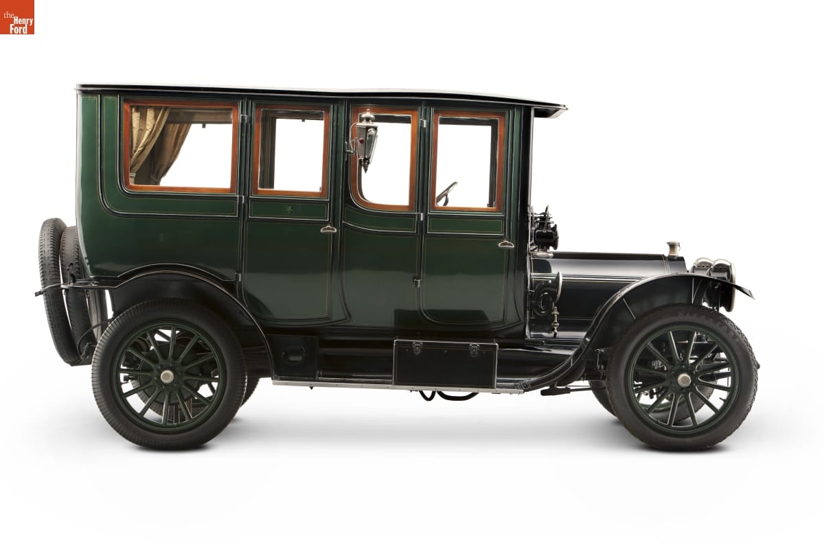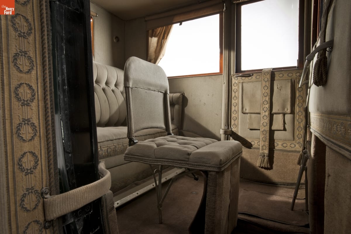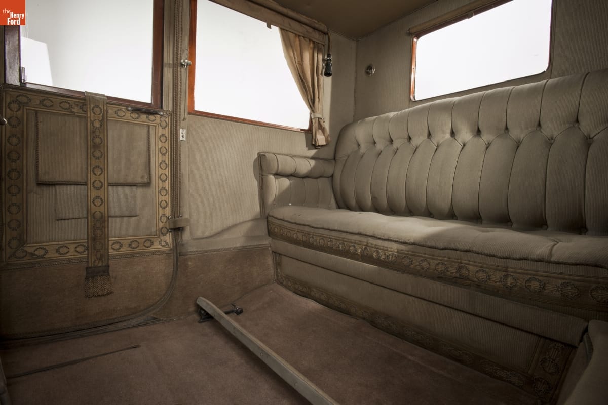 This limousine was designed to make a grand entrance. And it wasn't short on style either. Owners gazed through French plate-glass windows lined with silk curtains. They enjoyed an umbrella holder, a hat rack, a flower vase, and interior electric lights. Even the chauffeur's compartment was done up in leather and mahogany.