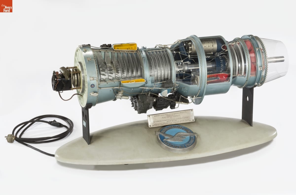 on plate: QUARTER-SCALE MODEL OF THE FAMOUS J-57 ENGINE/ PRESENTED TO/ FORD MOTOR COMPANY/ BY/ PRATT & WHITNEY AIRCRAFT DIVISION OF UNITED AIRCRAFT CORPORATION / JANUARY 22, 1959 / IN RECOGNITION OF FORD'S CONTRIBUTION TO THE NATIONAL DEFENSE IN BUILDING / PRATT & WHITNEY AIRCRAFT ENGINES, UNDER LICENSE, OVER A SPAN OF NINETEEN YEARS. on seal: PRATT & WHITNEY AIRCRAFT / DEPENDABLE ENGINES. on side of stand: Atkins & Merrill / INCORPORATED / SOUTH SUDBURY, MASS. on plate on end: G-3646-7