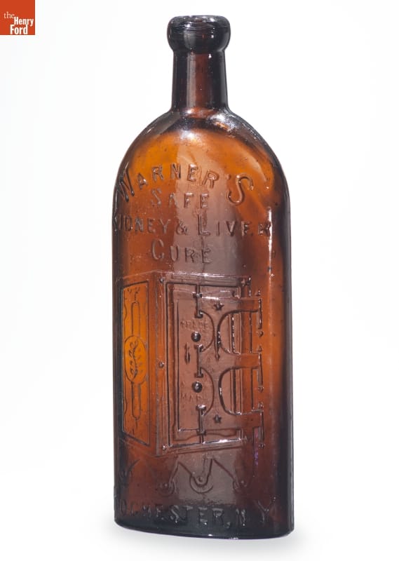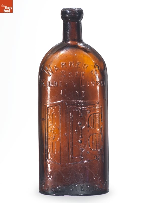 Hulbert Harrington Warner, a wealthy New York fire- and burglar-proof safe manufacturer, purchased a medicinal formula from a local doctor and created a multi-million-dollar patent medicine business in the late 1800s. Warner bottled his "cures" and sold them worldwide. The safe on the front of this bottle referenced Warner's previous business enterprise and alluded to the product's perceived safety.