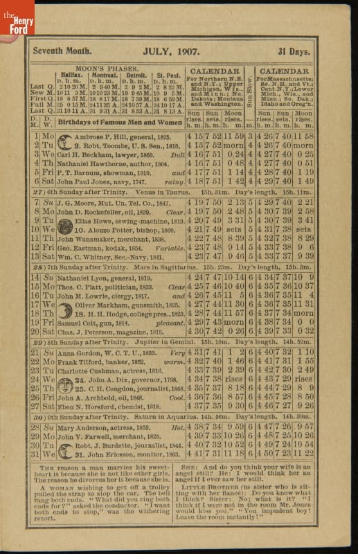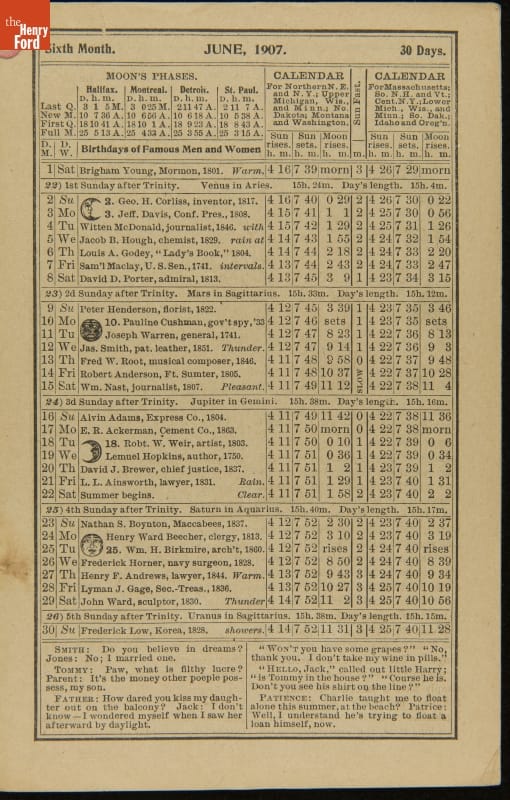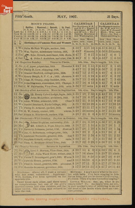 Almanacs contained practical information about the coming year. Readers normally found a calendar, weather predictions, tide schedules, and information related to astronomical events, agriculture, health, politics and other matters. Interspersed were jokes and witty sayings. Beginning in the late 1800s, James Cook Ayer, a keen advertiser and successful patent medicine dealer, published almanacs to entice the public to buy his line of products.