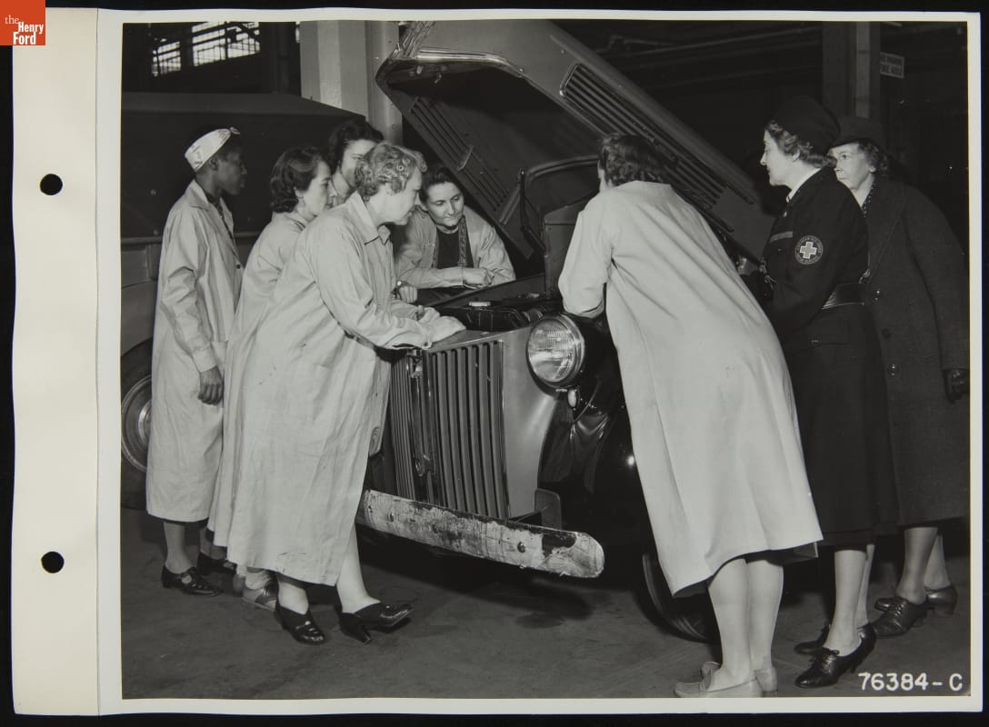 In 1941, Ford Motor Company provided automobile maintenance classes at its Highland Park facilities for the local Red Cross Volunteer Motor Corps. Instructors trained the volunteers in the mechanical skills they would need to keep their vehicles moving in times of emergency. Along with providing space for training, Ford also donated its 29 millionth Ford vehicle to the humanitarian organization.