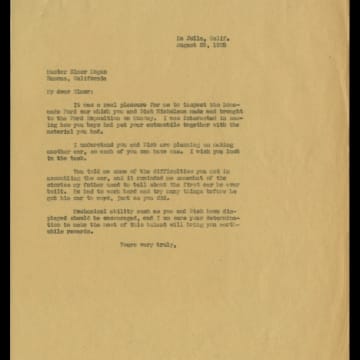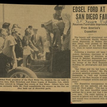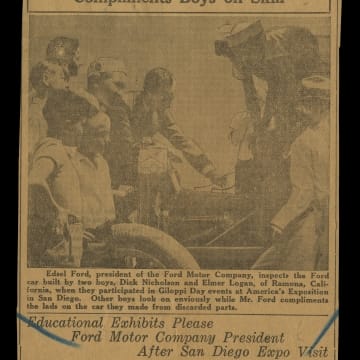 Take two mechanically inclined boys and a bunch of spare Ford parts and you may soon have a running automobile. Elmer Logan and Dick Nicholson built a vehicle for a "jalopy" contest at the 1935 California Pacific International Exposition in San Diego. Their entry may not have been pretty, but Edsel Ford was impressed with the boys' determination and ability.