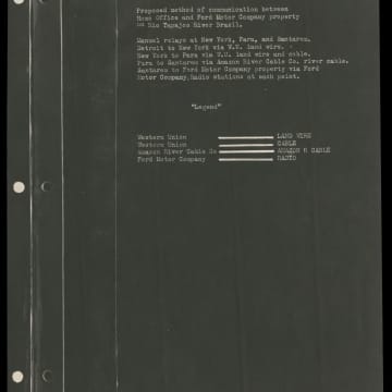 Henry Ford established Fordlandia and Belterra in the Brazilian rainforest to supply rubber for automobiles. He began shipping machinery and supplies to the Amazon in 1928. This map traced the routes by which materials were sent from Ford's facilities in Dearborn, Michigan, to Fordlandia, some 3,600 miles away. The plantations failed and Ford Motor Company abandoned the project in 1945.