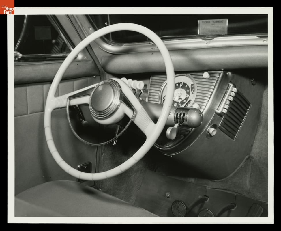 The Tucker 48's driver controls were underdeveloped compared with the car's exciting exterior. The steering wheel, in fact, was secondhand. Ford Motor Company supplied Tucker with steering wheels from its Lincoln Zephyr line. That cooperative gesture seemingly undercut the argument that Detroit's Big Three -- or Ford, at least -- were out to destroy Tucker.