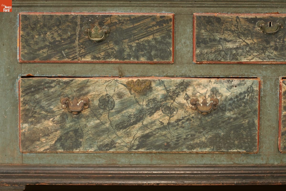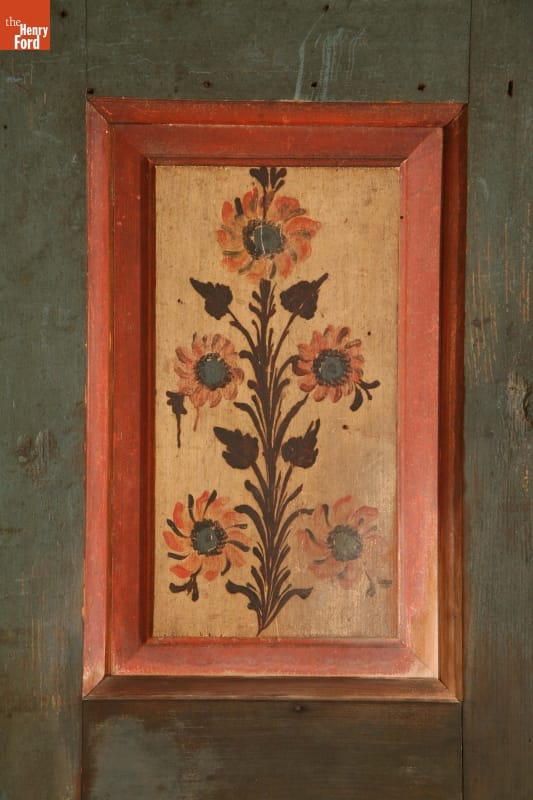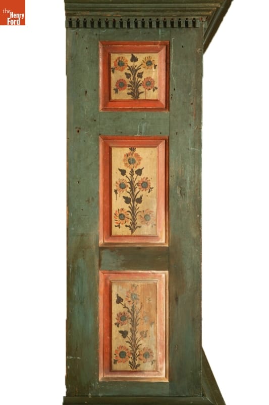 In the German immigrant areas of Pennsylvania, painted wardrobes with floral scenes were commissioned by prosperous farmers and merchants to show off their wealth and sophistication. This wardrobe is larger and more elaborately decorated than most, retaining much original paint, including extensive faux finishes on the drawer fronts.