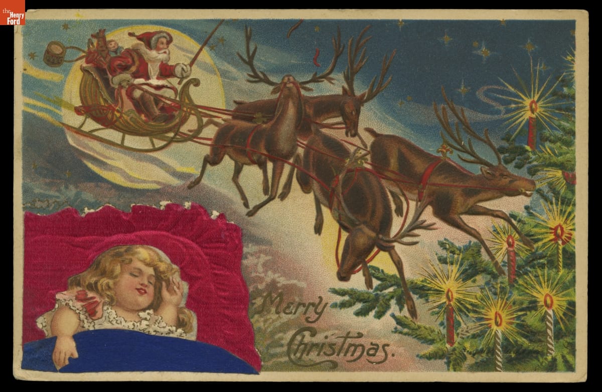 Christmas Greeting Postcard, Santa and Reindeer Dream by Sleeping Child, "Merry Christmas," 1907-1910