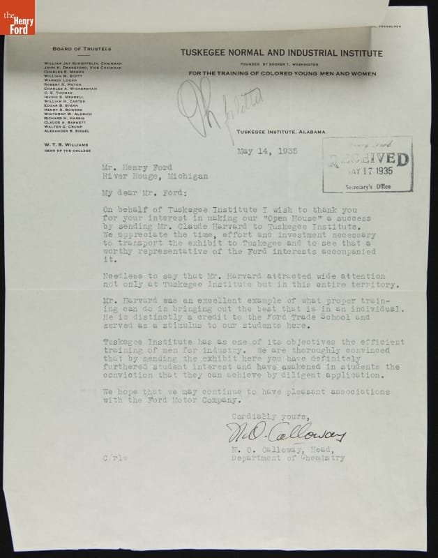 Correspondence between Frank Campsall (for Henry Ford) and N. O. Calloway regarding Claude Harvard's Visit to Tuskegee Institute, May 1935