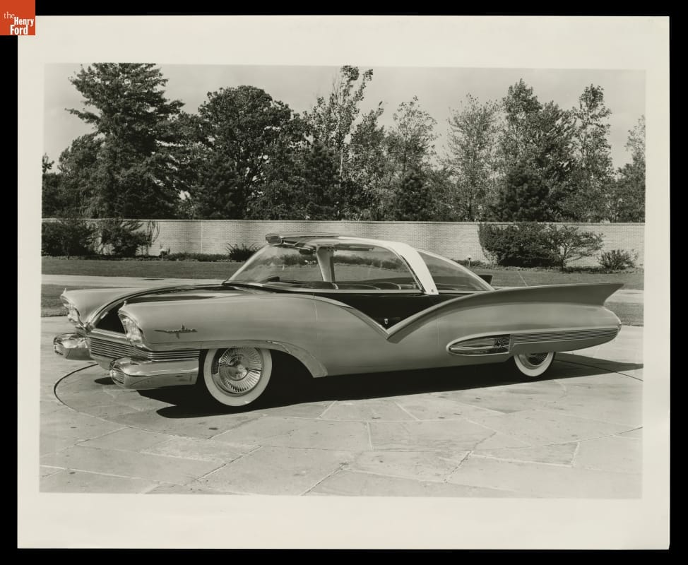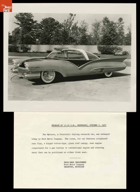 The 1955 Ford Mystere concept car epitomized jet-age automotive design. The car's tilting roof canopy and swiveling seats eased entry and exit, and its throw-over steering wheel could be used from either front seat. Promotional material described the Mystere as being powered by a rear-mounted gas turbine engine, but the physical show car had no engine and was not functional.