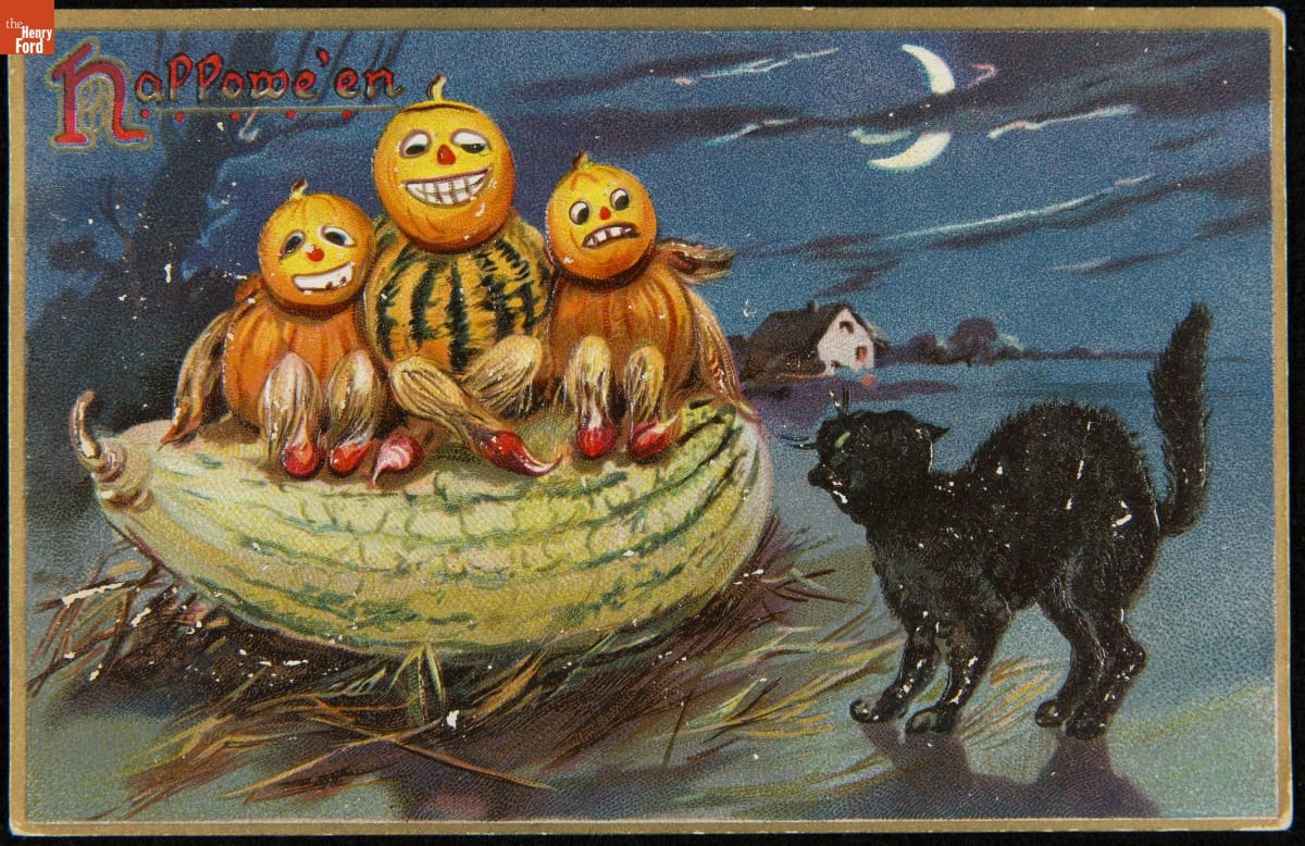 By 1900, articles in magazines and newspapers had helped spread and popularize Halloween customs and images like jack o-lanterns, black cats, witches, or bobbing for apples to a national audience. Some people marked the holiday by mailing a Halloween-themed postcard greeting to family or friends. During the first two decades of the 20th century, sending postcards was an easy--and popular--way to communicate.