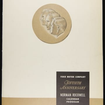 Henry Ford II, president of Ford Motor Company, commissioned a calendar from the celebrated American illustrator Norman Rockwell to commemorate the company's 50th anniversary in 1953. Ford urged its dealers to purchase these calendars and distribute them to their customers. The calendars, as this brochure advises, will be a "constant goodwill reminder" and "will work for the good of your business."