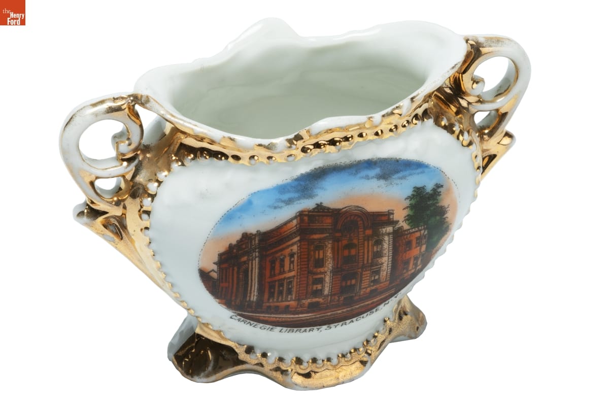 Andrew Carnegie (1835-1919) amassed an immense fortune from railroads, oil, and steel. He devoted his later years to philanthropy. Between 1886 and 1919, Carnegie donated more than $40 million to build 1,679 new libraries in communities of all sizes across America. The library building depicted on this vase was built in 1905 in Syracuse, New York, with a $200,000 Carnegie grant.