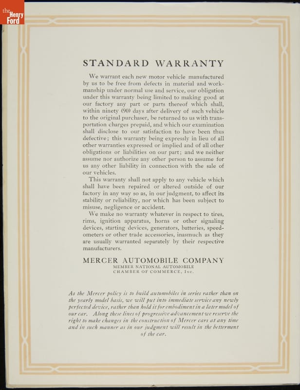 The Mercer Automobile Company of Trenton, New Jersey, was founded in 1909 and quickly made its reputation in performance cars. Its early Raceabout models boasted a top speed over 70 miles per hour, and they were popular on the road and on the track. Unfortunately, problems with management and money combined to close Mercer in 1925.